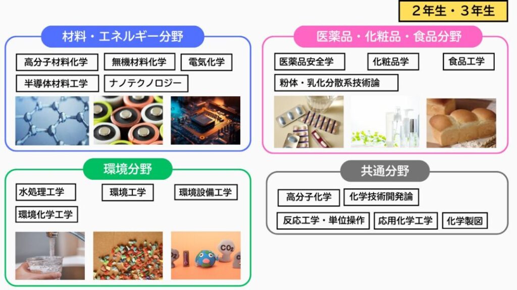 化学の専門分野への理解を深めるために、応用化学コースでは自身の関心に応じて各分野の実践的知識を学ぶためのカリキュラムを用意しています。