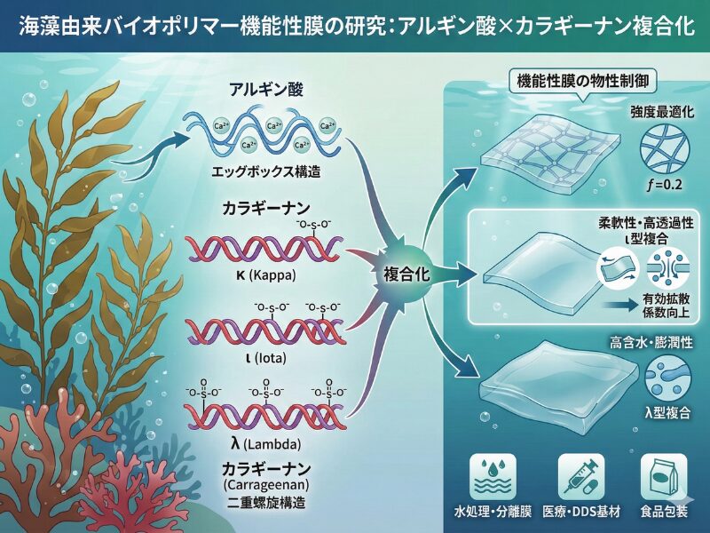 本研究の主役は、褐藻類から採れる「アルギン酸」と、ゼリーの凝固剤などにも使われる紅藻類の「カラギーナン」です。この2つを独自のレシピで混ぜ合わせ、金属イオンで固めることで、全く新しい性質を持つ「膜(フィルム)」を作りました。 実験では、混ぜるカラギーナンの種類(カッパ・イオタ・ラムダ)や量を変えるだけで、膜の「硬さ」や「伸びやすさ」、さらには「物質の通しやすさ」まで自由にコントロールできることを発見しました!特に「イオタ」という種類を使うと、柔軟で物質をよく通す膜ができることが分かりました。