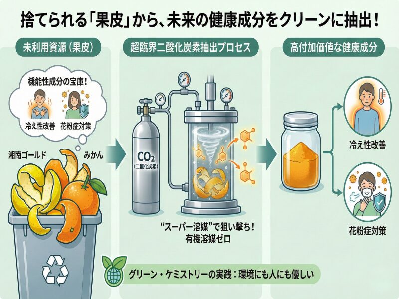 この研究は、廃棄されるはずだった資源を有効活用し、かつ環境負荷の低い方法で高付加価値な成分を生み出す「グリーン・ケミストリー」の実践です。地域資源の活用と最先端の化学工学を融合させ、人々の健康に貢献することを目指しています。