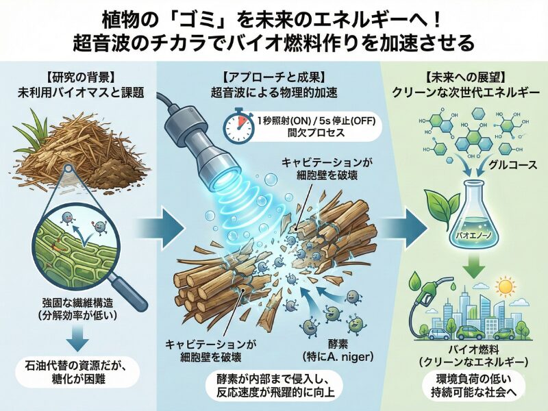 そこで本研究では、化学薬品を使わない物理的な加速手法として「超音波」に着目しました 。酵素が熱で機能を失わないよう「1秒照射・5秒停止」という独自の間欠照射プロセスを確立 。実験の結果、超音波が生み出す衝撃(キャビテーション)がバガスの強固な細胞壁を物理的に破壊し、酵素(特にAspergillus niger由来)が内部まで入り込むことで、反応速度が飛躍的に向上することを実証しました 。